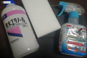 最初は家にあった物で済ませようと、無水エタノール+メラニンスポンジで掃除しました。